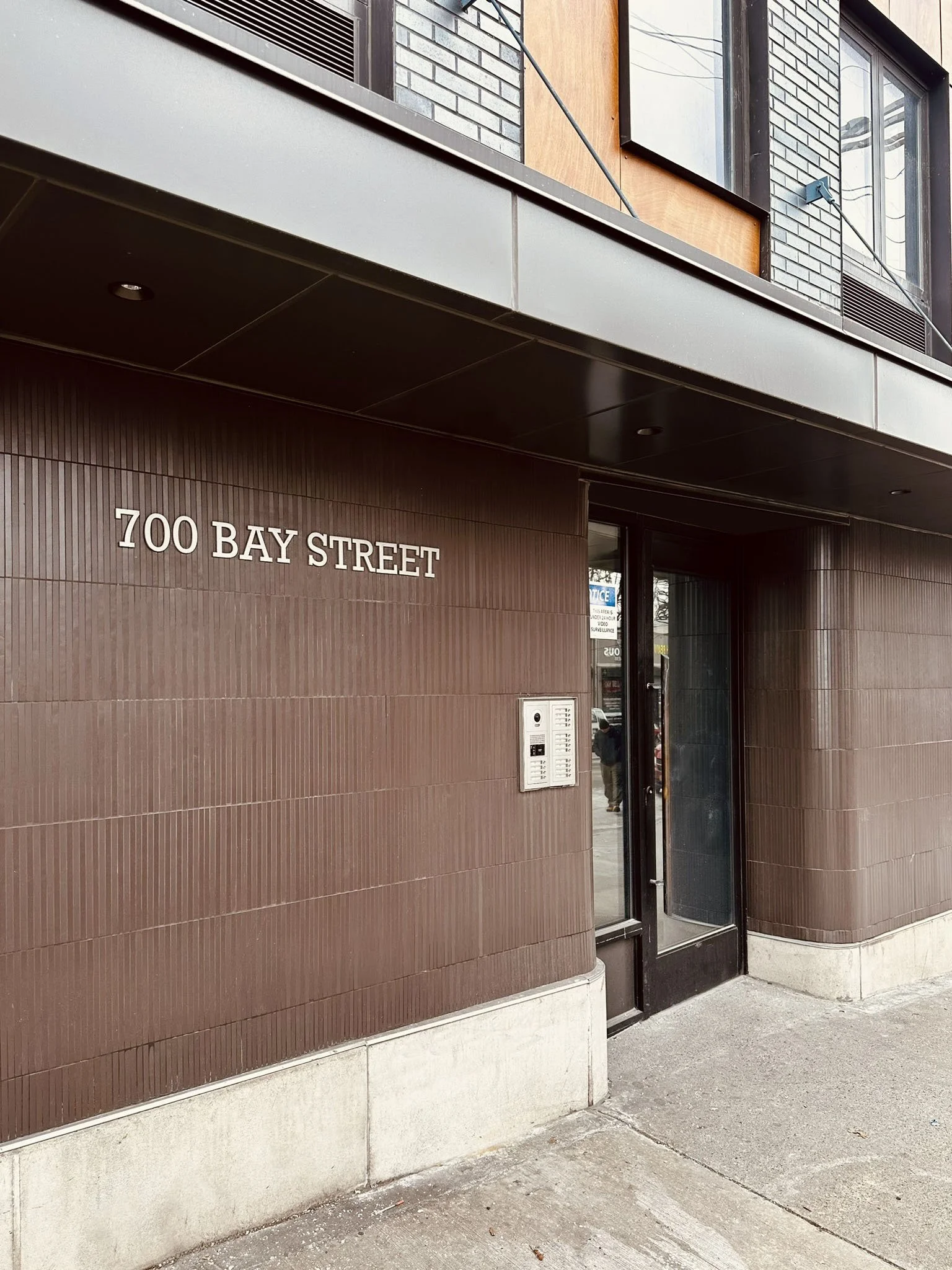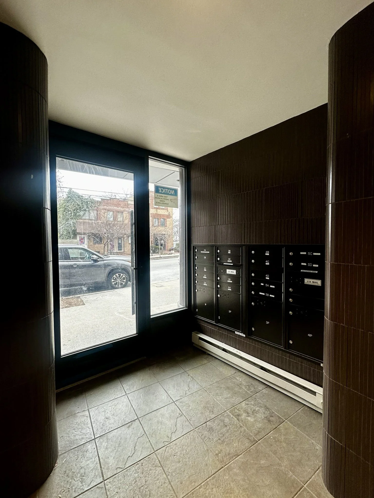By wrapping the exterior tile around rounded corners, the previously un-articulated lobby now creates a smooth, meandering path from the street to the apartments above.
