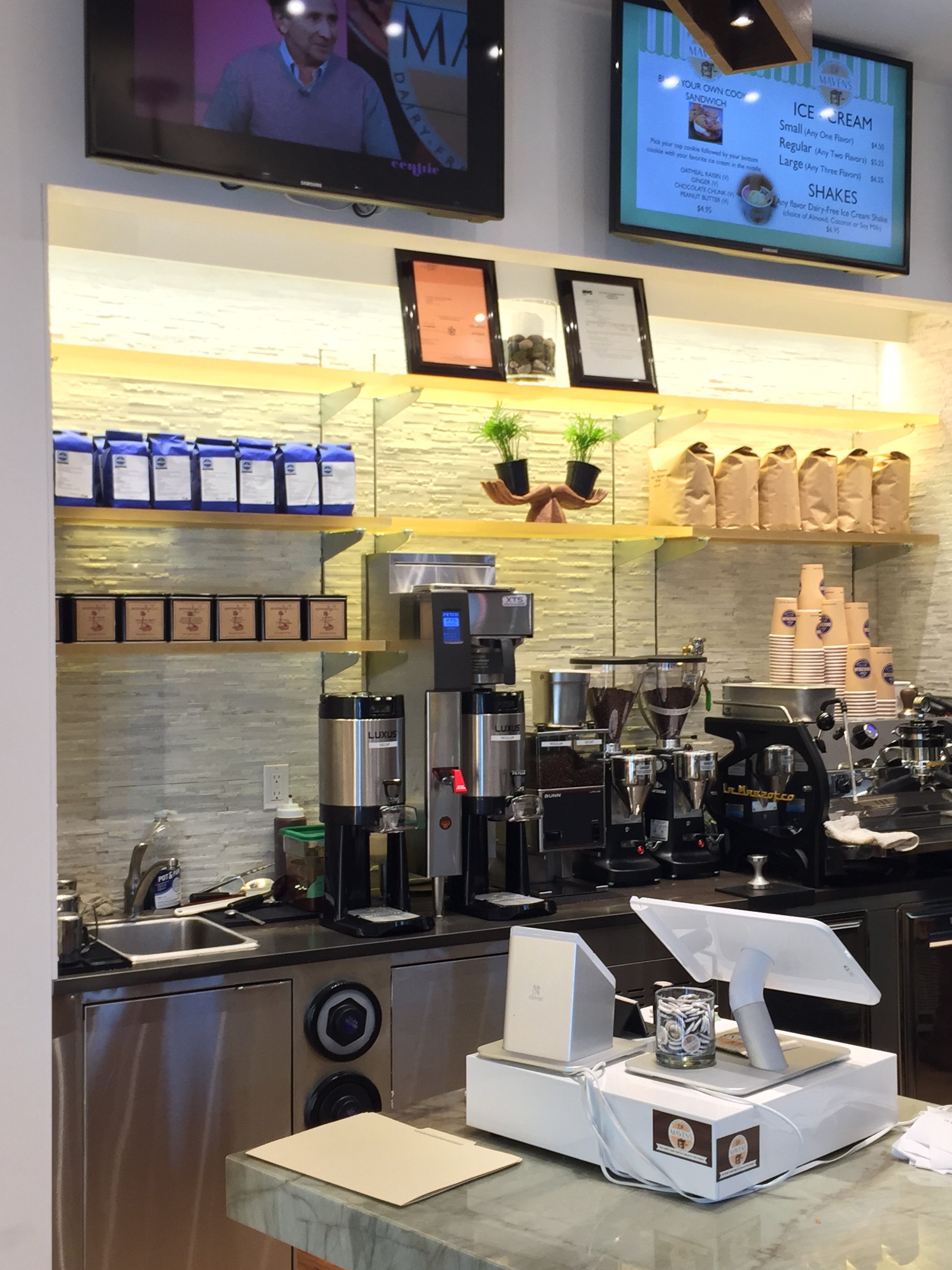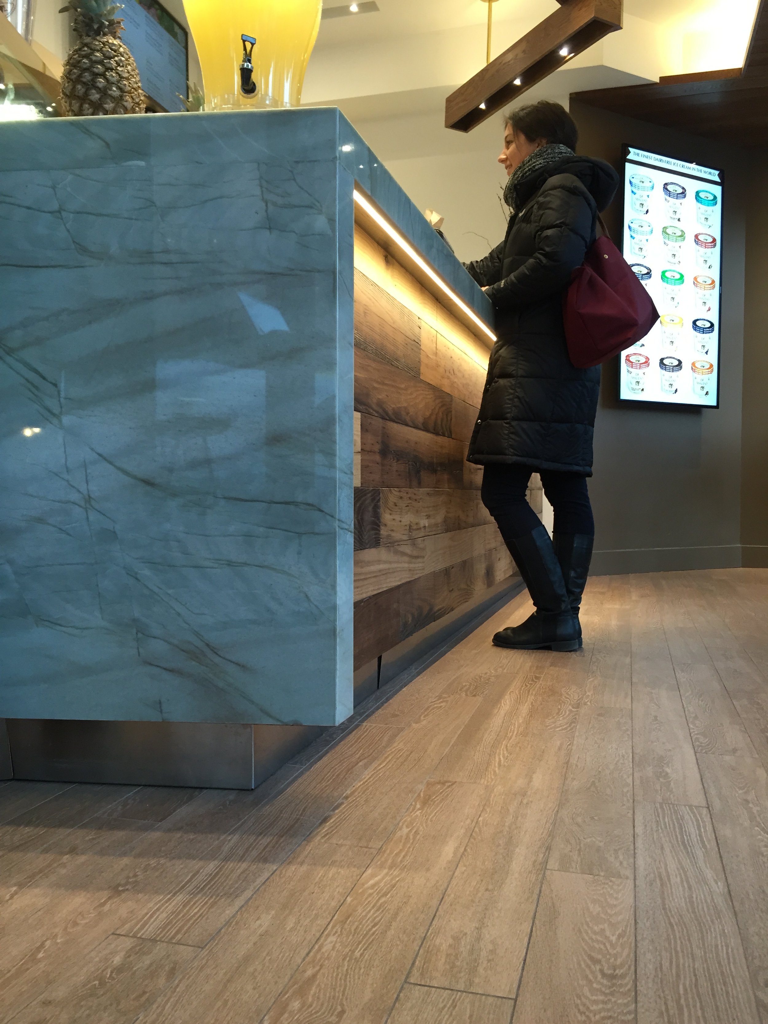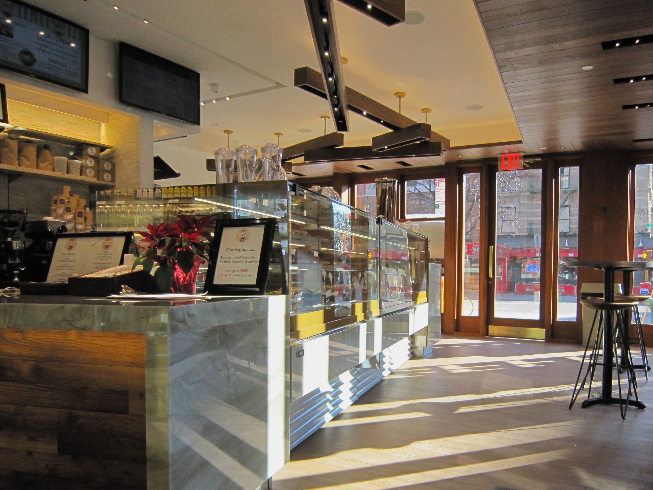 Bringing dairy-free desserts along with all-day juice, coffee and snack options to a small corner storefront in the East Village as bound to create a packed, busy space. My solution was to crank the counter space to expand its footprint, setting in motion a play of overlapping angles throughout the space. The storefront itself is rich in its simplicity - wood with minimal hardware, it can be opened entirely in warm months but when closed, its minimal sight lines disappear, letting the serving counter become its own merchandising.