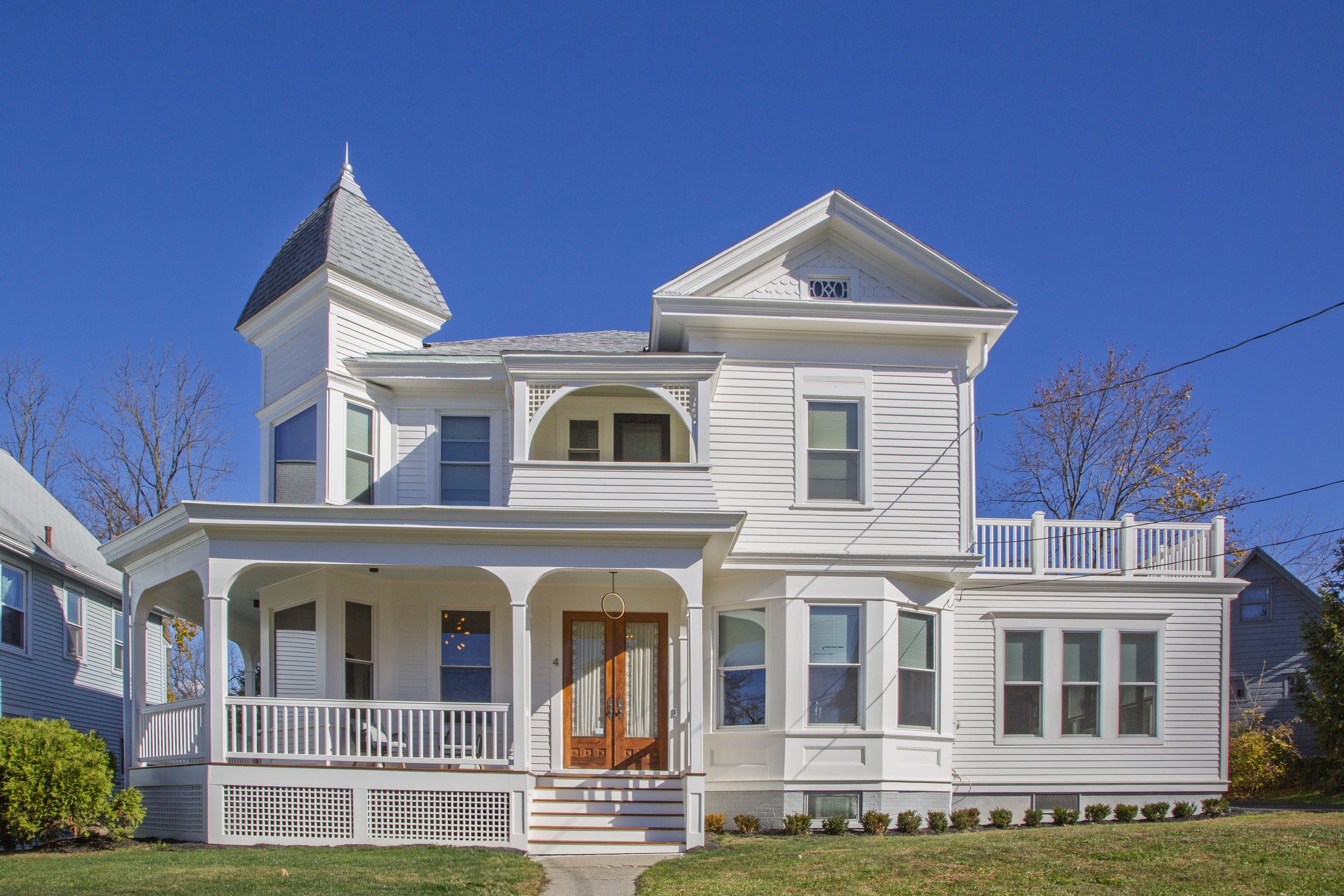 Like many historic houses in Hudson, many original details had been removed and the entire exterior was covered in vinyl siding. The original wrap-around porch was structurally compromised - we carefully rebuilt it, re-creating historic arched post caps, screens, and railings around all-new framing. At the southern end of the home, a single-story mid-century add-on threw off the proportions of the original house and created a cramped living space - we re-built the roof of that room to harmonize its height to the main structure, and took the opportunity to create a generous roof terrace off the main stair, with sweeping views of the town.